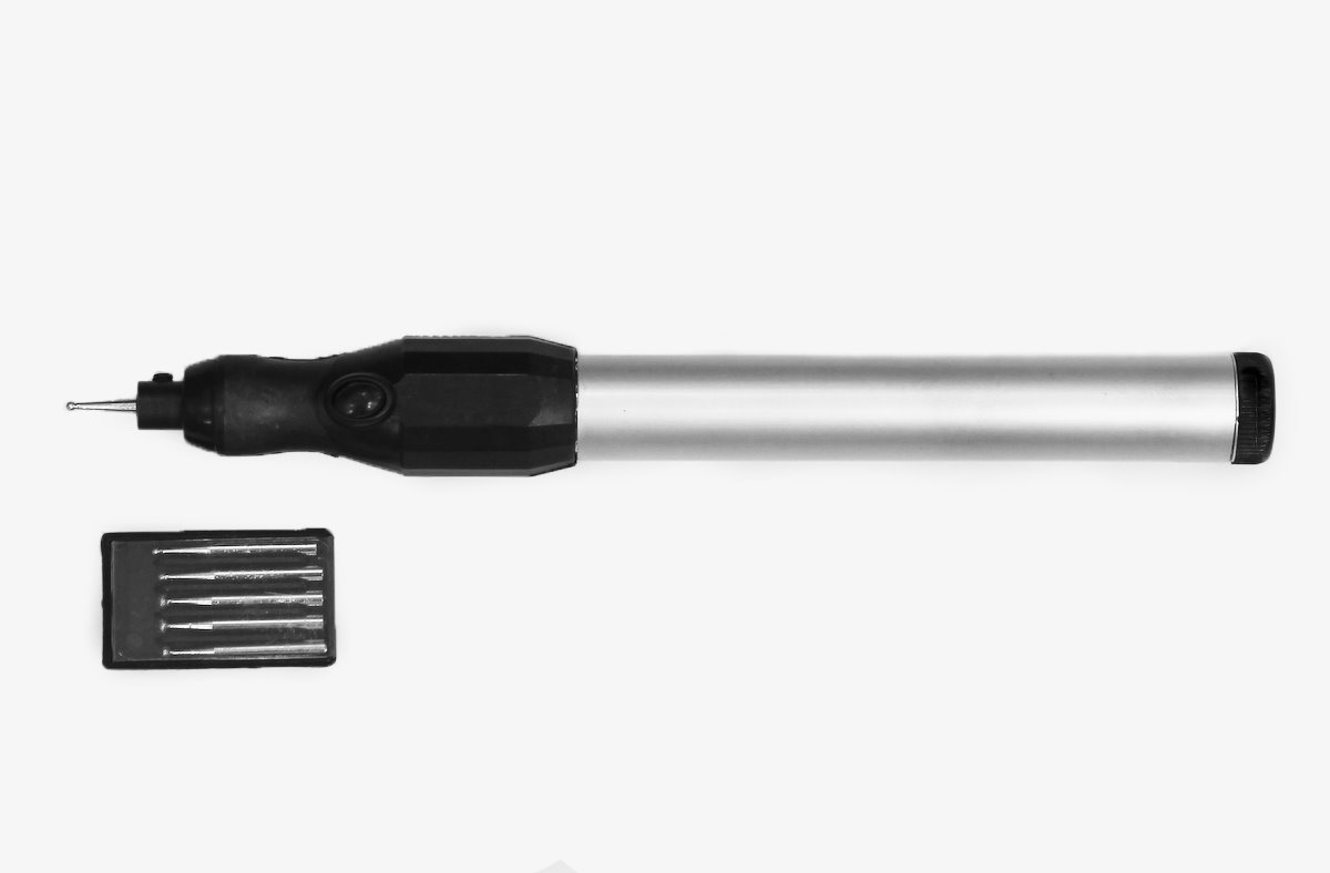 Handgravyrmaskin som är lämplig för mjuka metaller, glas och trä.Inkluderar 2 stift.